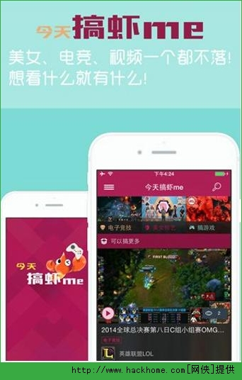 今天搞虾Me安卓版apk是一款关于电竞新闻资讯的手机移动端。通过该软件,你可以在这里每天观看美女主播为你播报最新的电竞信息,比赛视频或者相关内容,同时还有精彩游戏宣传视频及Coser图秀带给您更丰富的游戏资讯。网侠小编把该软件推荐给热爱电竞的玩家们,让您第一时间领略游戏为您带来的乐趣!
