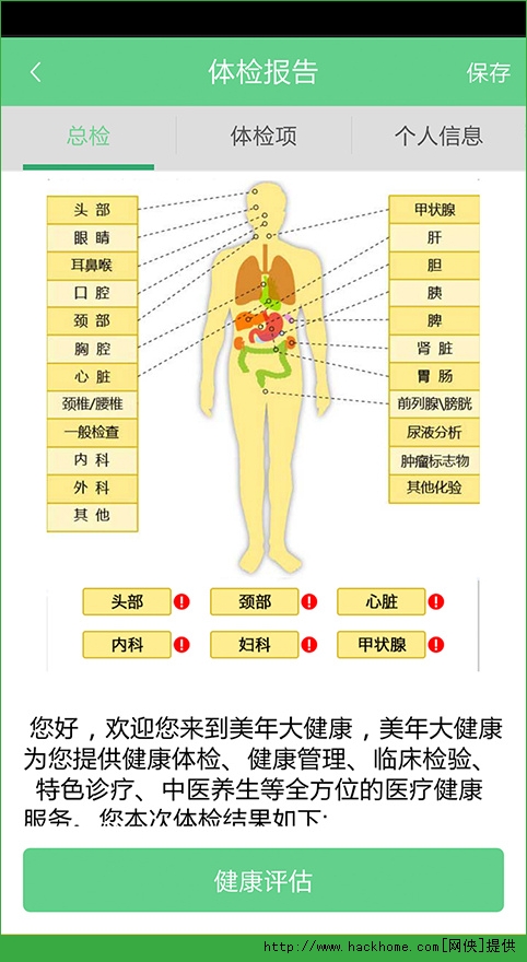 2、使用美国哈佛医学博士团队的先进算法对用户健康数据做分析,结合美年大健康集团全国个人体检数据分析结果为依托,评估用户个人健康综合状况;