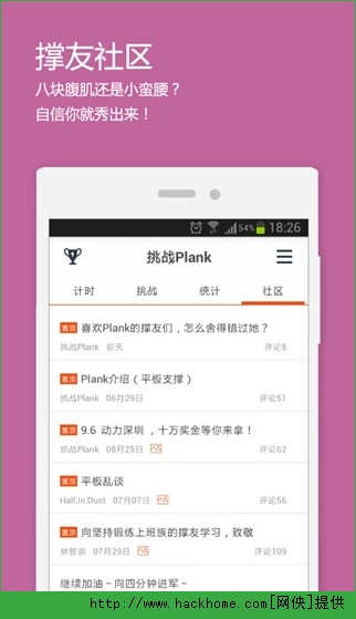 挑战Plank安卓手机版app:这是一款最专业的平板支撑训练软件,plank社区是时下最火健身运动,居家必备虐腹神器!想要造就好身材吗?那就来挑战Plank吧!