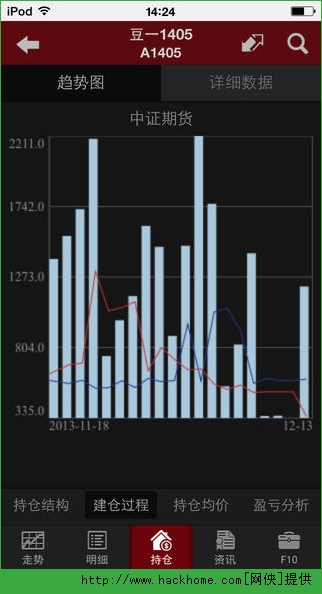 3、每个品种除基本的行情k线之外,还有明细、持仓、资讯、F10等数据全方位展示。