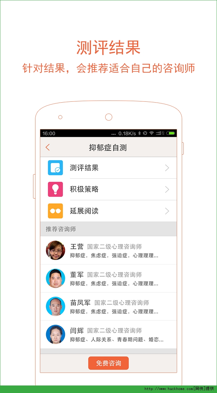 用户通过完成最专业的心理学测评,用最简单、科学、快捷的方式得知自身的心理健康状况,测试包含抑郁自评量表、压力反应量表、心理健康症状自评等。