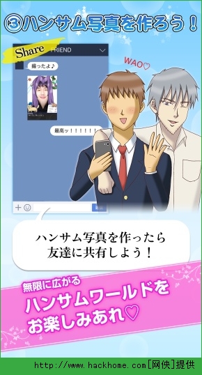 2、游戏中玩家只需把自己或者他人的照片导入到《帅哥相机》当中,然后合成《学园帅哥》中的“帅哥”们的形象。