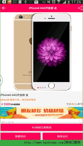 朋友越多,价格越低。出价后请朋友免费顶价,或者砍价,用意想不到的价格买到商品。