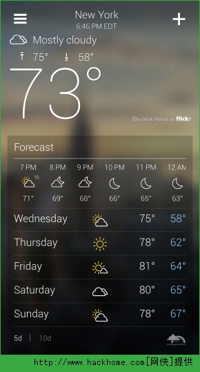 与其他的天气预报软件不同的是,根据不同的季节,天气情况,你的位置信息和你喜欢的地点,雅虎天气会从Flickr上为你挑选精美的照片,界面美的让你天雨心也晴~!