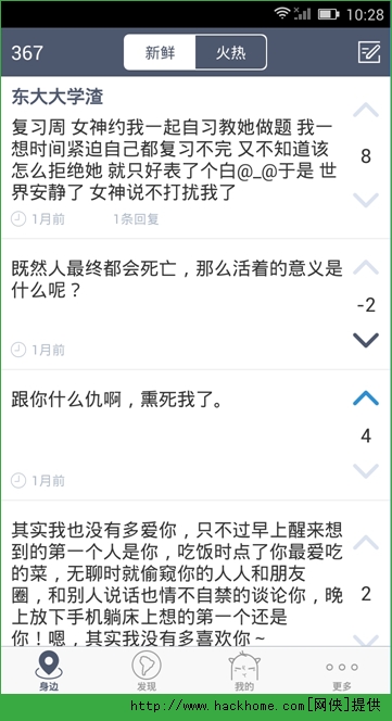 每天的话题都能引爆讨论,匿名发帖,秘密啥的说出来真痛快,不过主要使用人群是大学生,未成年人及社会人群不建议加入。