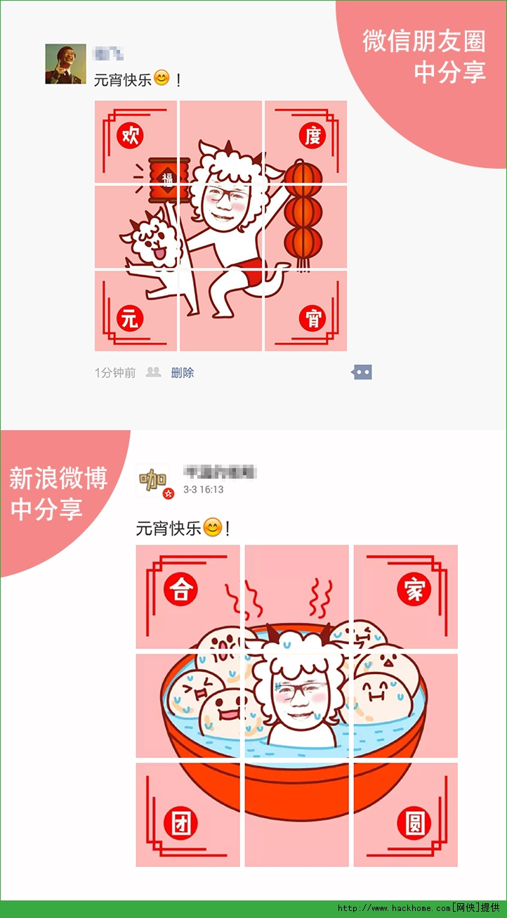 9Face安卓手机版app:这是全新的照片新玩法的社交软件,9Face可以识别一张照片中你的头像,合成一张祝福照片并切割成9张,分享到微信朋友圈、新浪微博、易信等地方,而且分享后点开每张小图,里面都会有随机的羊年愿望签,等待惊喜吧!