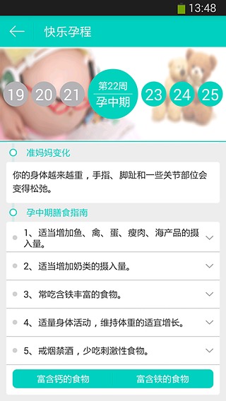 5、记录与评估:月经、运动、膳食、身高体重、腰臀围、血糖、血压、心率、排便、胎动、体温、基础体温、心情等,身体指标记录时软件即时按医学标准进行评估。