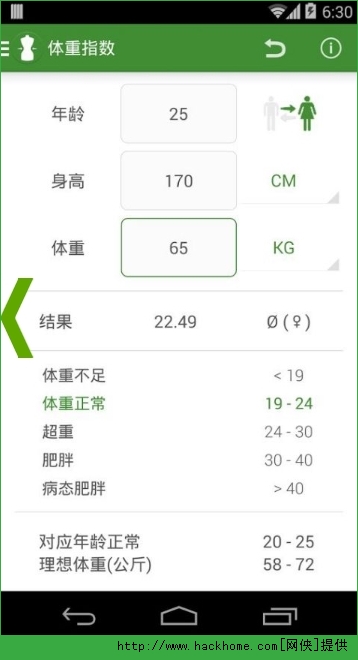 体重指数计算器安卓手机版:一款计算体重、身高的应用软件,该应用可以免费计算体重指数(BMI)和)腰围身高比(WHtR)。在该应用上面你可以计算自己的体重指数和腰围身高比值,根据年龄和性别找出你的理想体重,然后根据自我控制达到最完美的身材哦~
