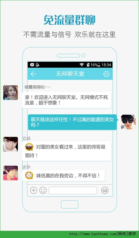 只要打开约你,附近的人都会进入无网聊天室,免流量聊天无延迟更方便。