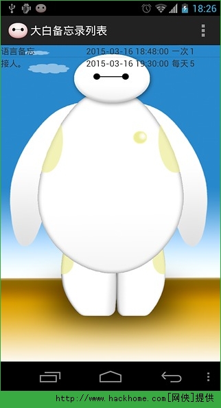 大白备忘录安卓手机版app:这是一款以大白为背景的手机备忘软件app,这款app不仅有着备忘录的基本功能,而且您还可以看到很多大白的卡爱的壁纸的呦,喜爱大白的朋友不要错过的呦!
