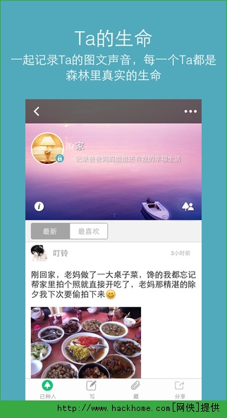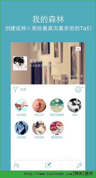 2、【亲密的那些事物召唤亲密的人】森林里每一个亲密事物都可以召唤不同人来一起维护,设置不同的可见范围。这种方式不仅解决了微博、朋友圈隐私无法控制的问题,更突出了每个事物本身的含义。建一个“家”,让父母在这个家里都可以看见远方的您。
