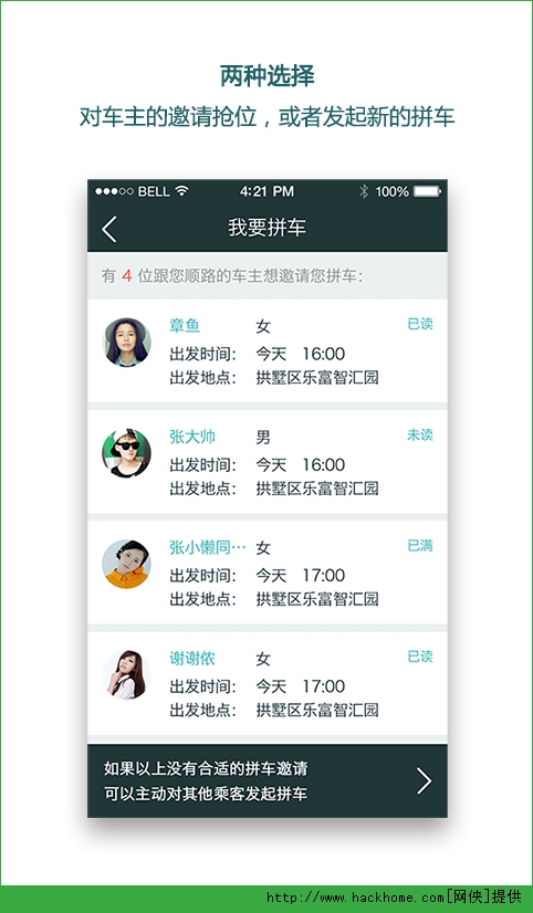 1、我们为车主和乘客提供了两种体验一致的拼车方式:选择别人的拼车邀请,或者对另一方发起新的拼车。
