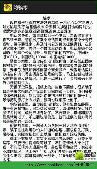 防骗术安卓手机版app:这是一款为您收集了各种骗术并给您建议的手机app,现在是不是经常受到各种诈骗的任何电话,短信等等呢?是不是很担心的呢?那就来下载这款app让您有了警惕之心,以后不会被骗的呦!
