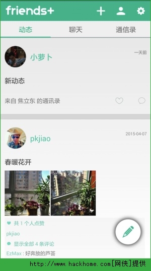 friends+社交交友安卓手机版APP:这是一款网络社交交友手机app软件,这款app手机软件可以将我们的动态分享到朋友圈,让给多的朋友认识你,也可以主动推送一些好友,让你能更方便的去认识其他人。