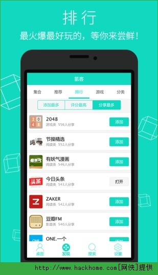 1、氢客是一款Html5应用聚合资源及分发平台,汇集了数千款当下最流行的H5免费应用,收录了最全的Html5游戏集合;
