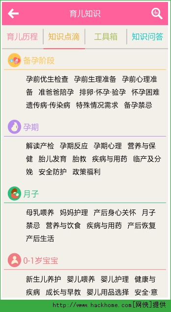 2、知识点滴—一站式提供从孕前,到孕期、生产、月子,以及0~10岁幼儿的知识讲解。