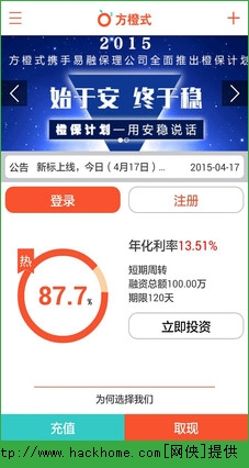 方橙式安卓手机版app是一款手机理财平台,具有稳定、高校、安全等优势,投资清晰直观,充值提现方便,100元起投12%-15%年化收益,是您贴身的时尚理财管家。