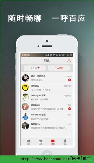 3、消息:活动消息、令令消息、个人消息,只需一键即可完成互动、查看与畅聊;