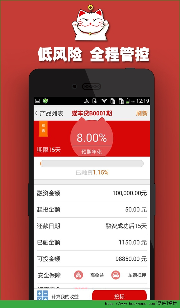 每日新产品上线预告提醒,不怕错过短期高收益产品,旨在为您实现资产快速增值。全程手机端APP操作,享受萌化的界面,随时随地投资提现,0手续费,节假日照常计算收益。招财猫,一切尽在手指间。
