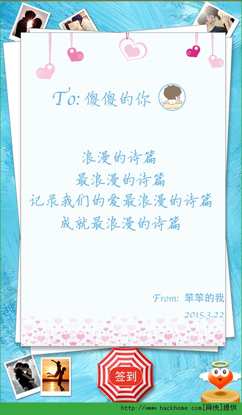 爱情签到安卓手机吧app:这是一款情侣社交软件,这款软件里面有很多情侣之间的互动游戏哦,你也可以通过这款软件晒出你们甜蜜瞬间。总的来说这款软件很不错,快下载吧~!