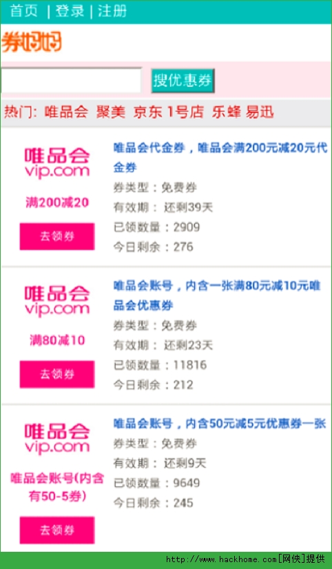 免费领取京东、唯品会、聚美优品、苏宁、当当、亚马逊、1号店和汉庭、携程、去哪儿等国内数千家网购网站优惠券