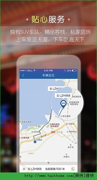 3、贴心服务:打造旅游线上线下一站式服务,独有SUV车队、精品客栈、高级厨师及私家厨房,上车浪迹天涯,下车吃遍天下。