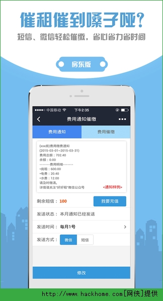 10、自动催租:通过微信或短信自动发送费用通知消息和催缴信息;