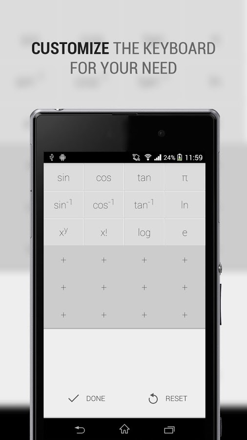 3、自定义键盘支持高级运算符、科学常量以及自定常量,你可以轻松的滑动键盘寻找你要的按键。