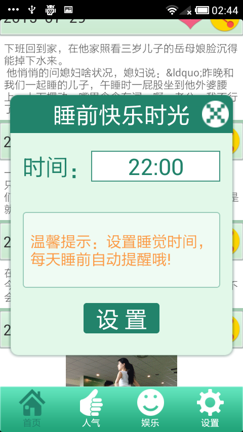 3、快乐时光可以设置睡前时间,每天睡前定时提醒,让您开心一阵子。
