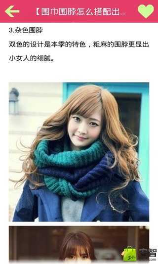 2、本软件为大家整理了最新、最潮流的围巾搭配技巧,通过本软件的学习,一定能够在这个冬天秀出不一样的你!