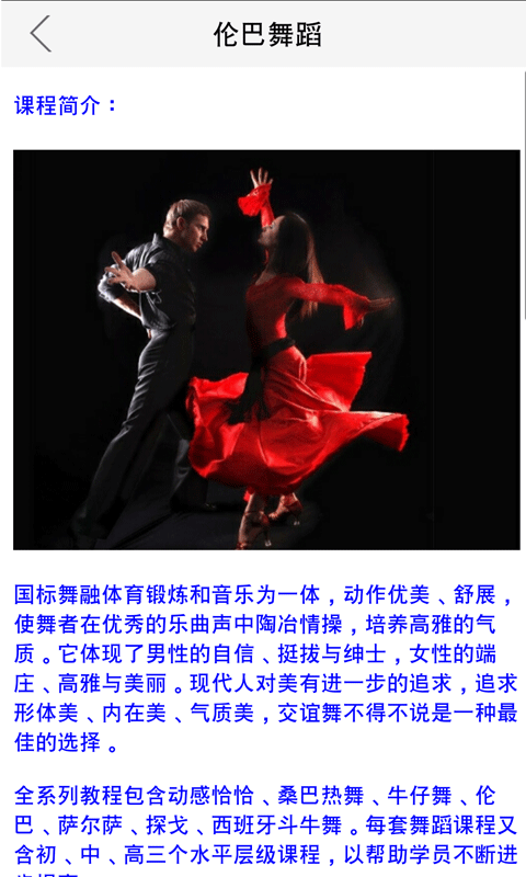 伦巴舞蹈初级APP是一款帮助你学习伦巴的舞蹈的软件。这款软件分类明确,配有优美的音乐和高清视频为你教学,让学习伦巴起来毫无压力。同时有纠错功能,循环播放。喜欢的朋友快来下载吧!