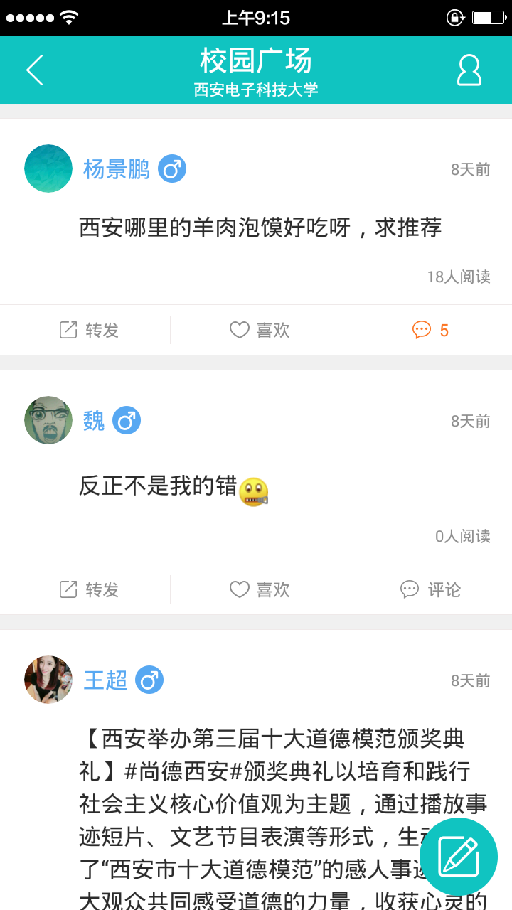 2.校园广场是《下课了》的社交模块,在这里可以和本校的同学畅所欲言,让不同年级不同人群在这里交流。首创了穿越式信息互动,用户不只是看到本校内的消息,还可以去校外穿越到其他学校看到所有的消息并进行互动。