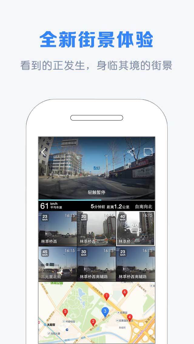 4、街景模式:实时图片视频覆盖全城,一手掌握全市交通状况。捕捉新鲜路况信息和奇闻轶事,和好友共同分享。