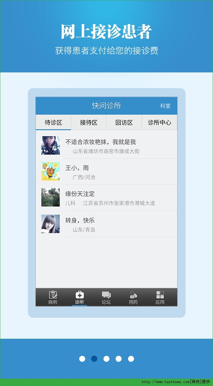 3、快问诊所:帮助医生实现网上执业,随时随地为患者提供有偿问诊服务。