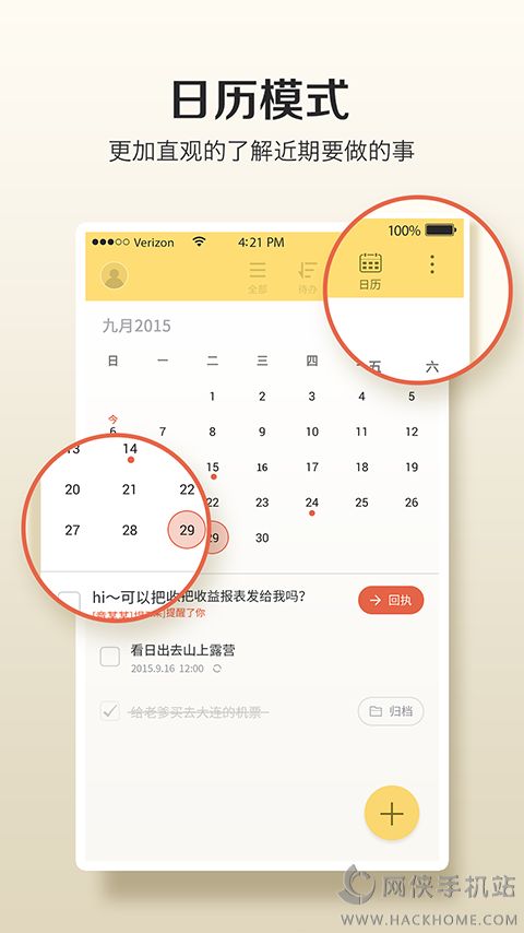 4、日历模式:简单明了的展现每天待办事项,合理清晰的规划让您与众不同,更加明白生活的真谛。