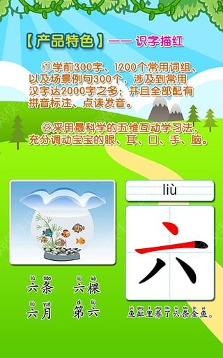 2.学前300字、1200个常用词组、以及场景例句300个,涉及到常用汉字达2000字之多;并且全部配有拼音标注、点读发音;