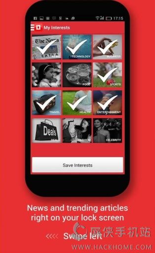 1、从12个分类中选择锁屏显示内容:新闻,商业,技术,体育,名人,健康,食品,旅游,时尚,娱乐,精神和交易;