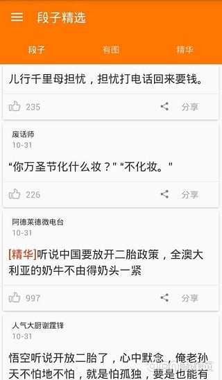 段子精选手机安卓版app是一款手机娱乐应用,最新最搞笑的段子,分分钟钟让你笑的肚子疼,不开心的时候拿出来看看,保证管用。