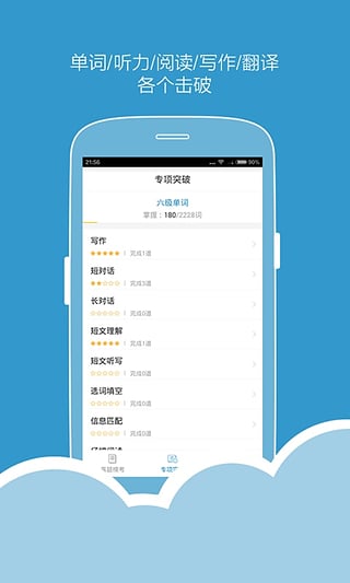 优答四六级安卓版app是一款针对大学生四六级英语考试的智能学习助手。这里包含四六级英语单词、听力、阅读写作、翻译、师优质视频讲解和历年四六级真题套卷等等。里面的资源都是最新最全的。学英语就用优答四六级吧!