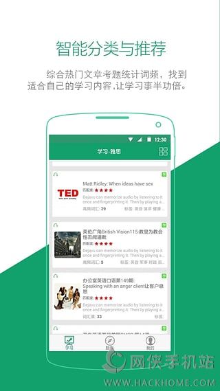 英语教科书,模拟试卷,是不是很枯燥?来听听BBC、CNN的最新新闻,智能引擎根据用户的学习目标和学习进度自动生成和推荐合适的实时内容;