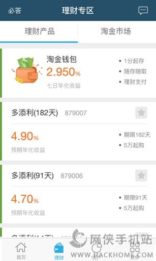 3、【淘金市场】理财产品的转让交易平台,用户既可以卖出已持有的产品,提前获得现金,也可以买入他人折价转让的产品,获得高收益。报价由您定,买卖得双赢。