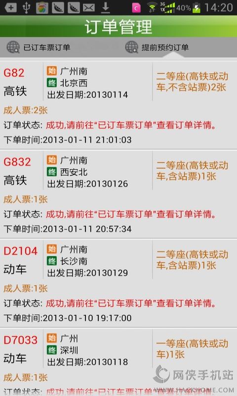 3、提前预约:通过“提前预约”功能,您可以提前登记预订信息,一旦系统查询您所预约的车票有余票,我们将第一时间为您自动订票。提前预约系统的订票规则跟正常订票规则相同,可预约预售期内(请参看客户端)从广东、湖南两省出发的列车车票。每个用户最多同时间提交3个预约订票请求。