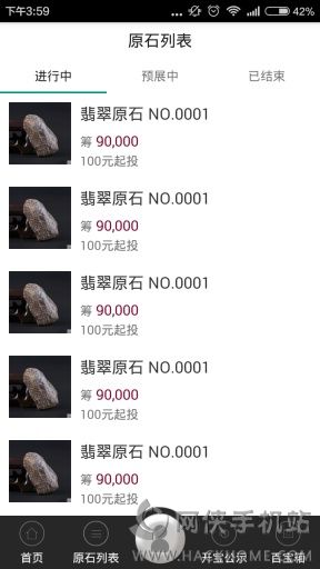 2、原石列表:参与投标的一些原石展示,分为进行中、预展中、已结束三个部分;