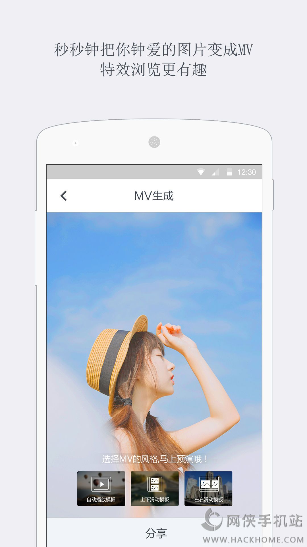 4、最文艺的音乐MV分享方式:你可以打开超级图辑任务挑选好图,也可以直接使用手机相册内的图片一键生成视听一体的音乐MV。无需生成庞大的视频、不占流量,愉快的分享朋友圈。