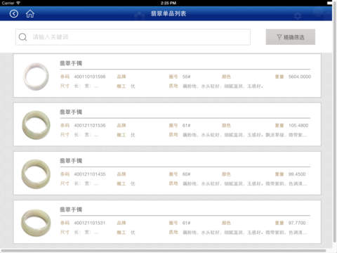 1.展示砖石类和翡翠类,以及对应下面的系列款式和每个款式的单品详情,可以根据精确条件进行筛选。。
