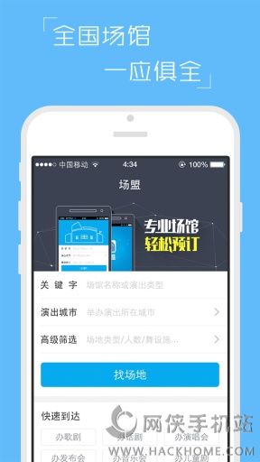 场盟app安卓手机版是一款为需要租赁演出场地的剧团打造的手机查询场地的客户端,直接通过app就能查看剧院,音乐厅等地的空档时间,还能在线询价,和商家谈妥还能在线付款,需要的亲们赶紧来下载吧!