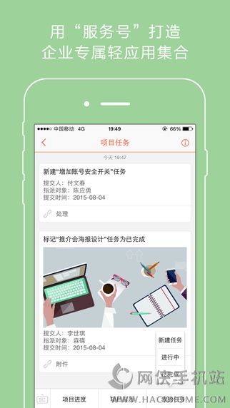 7、不管是通知公告、文化建设、员工服务,还是流程审批、知识分享、项目管理,用“服务号”打造企业和团队专属的轻应用集合,只有想不到,没有做不到;