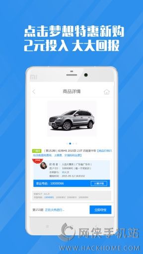 2、【2元抢豪车】在车来车网,车辆价格被分成若干等分,2元一份,用户可以购买一份或者多份,当等分全部售完后,由系统规则通过精确计算抽出一名幸运者最终得到车辆;