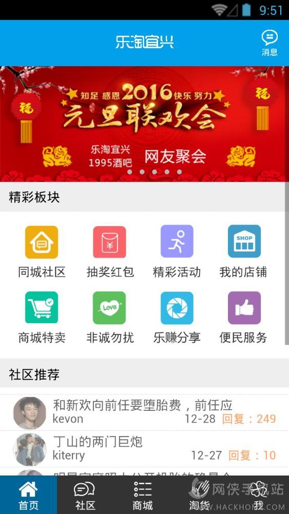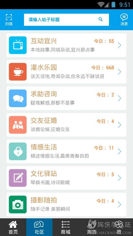 4、【社区】丰富的社区板块,你可以足不出户就能了解到宜兴的各类信息,交友、咨询、文化、招聘等;
