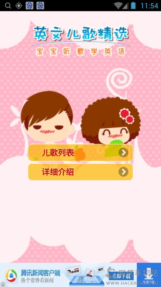听儿歌学英语手机版app下载是一款适合儿童英语启蒙的英文儿歌软件,通过可爱的卡通和声音,从视觉和听觉上帮助宝宝学习英语,促进宝宝智力发展!